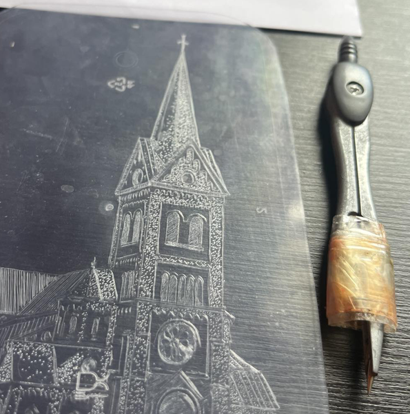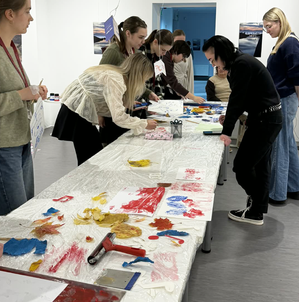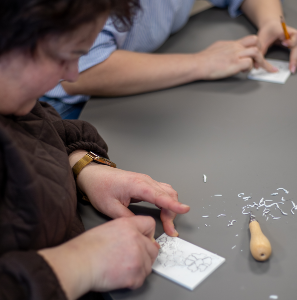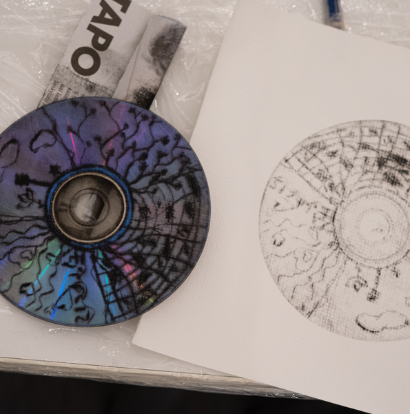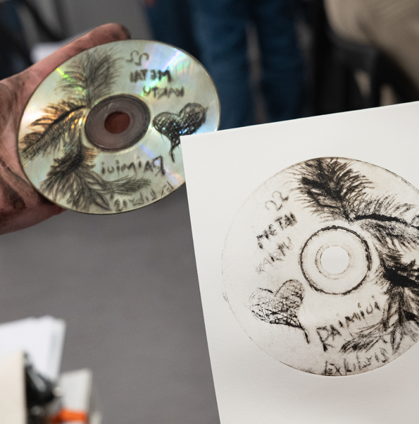 CD diskų raižymas – smagi giliaspaudės technika, kurioje dalyviai raižo diską, o piešinys vėliau perkeliamas ant popieriaus, sukuriant unikalų atspaudą.